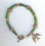 Numerous diamond shaped peridot colored Swarovski Crystals set off a charm of a Swallow placed in the center of this stunning, one of a kind bracelet. 4 intricate silver beads are positioned elegantly throughout this 8 inch bracelet.